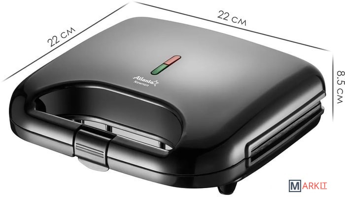 Размер нагревательных пластин: 21.5x12.5 см;Размер вафельницы: 22x22x8.5 см.
